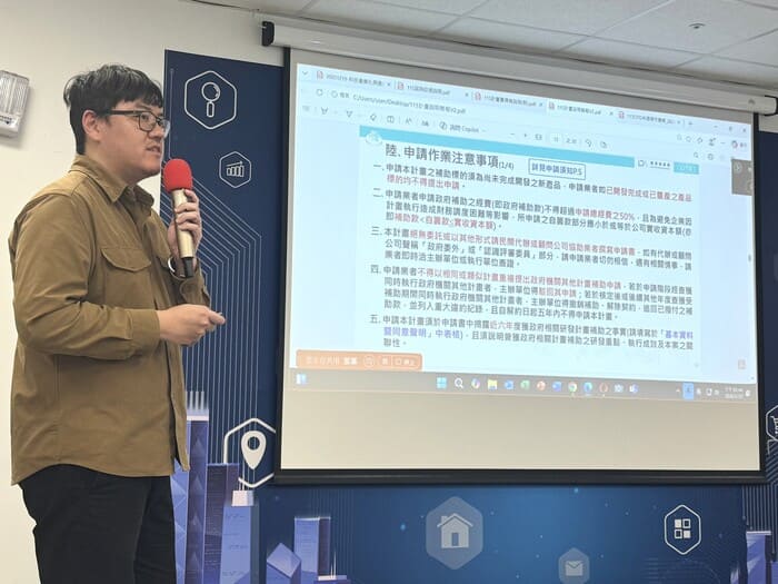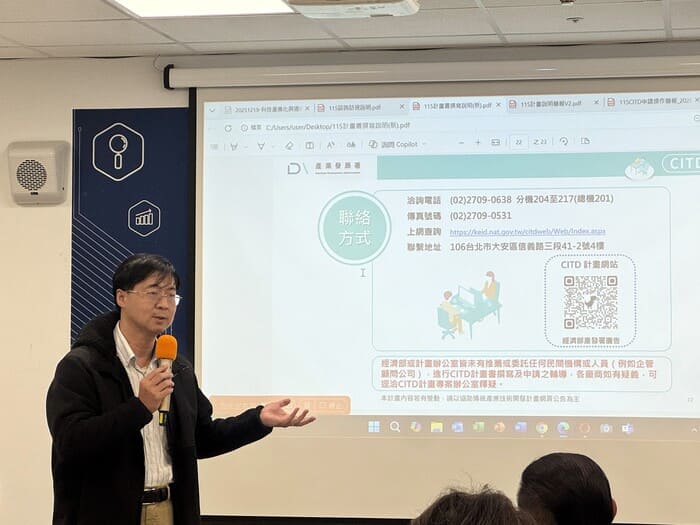 說明會中,中國生產力中心副管理師莊柏遵詳盡解說 115 年度 CITD 計畫的申請架構,並指出此計畫為銜接創業各階段的重要支撐機制,能引領新創團隊與中小企業在完成初步驗證後,有效運用計畫資源厚實技術深度,實現從「產品落地」到「技術升級」的無縫接軌,奠定長期的市場競爭力。